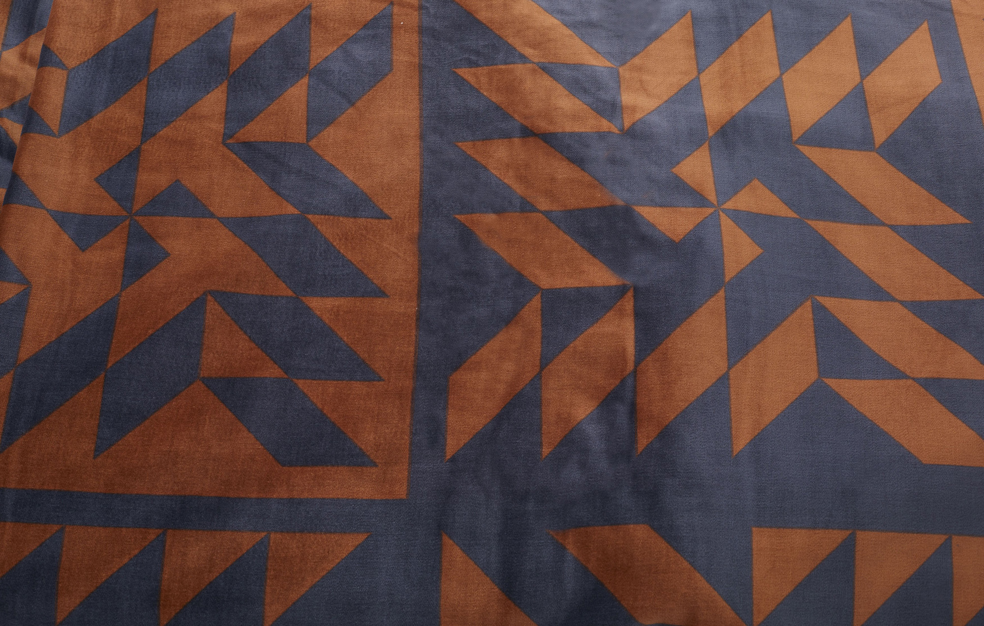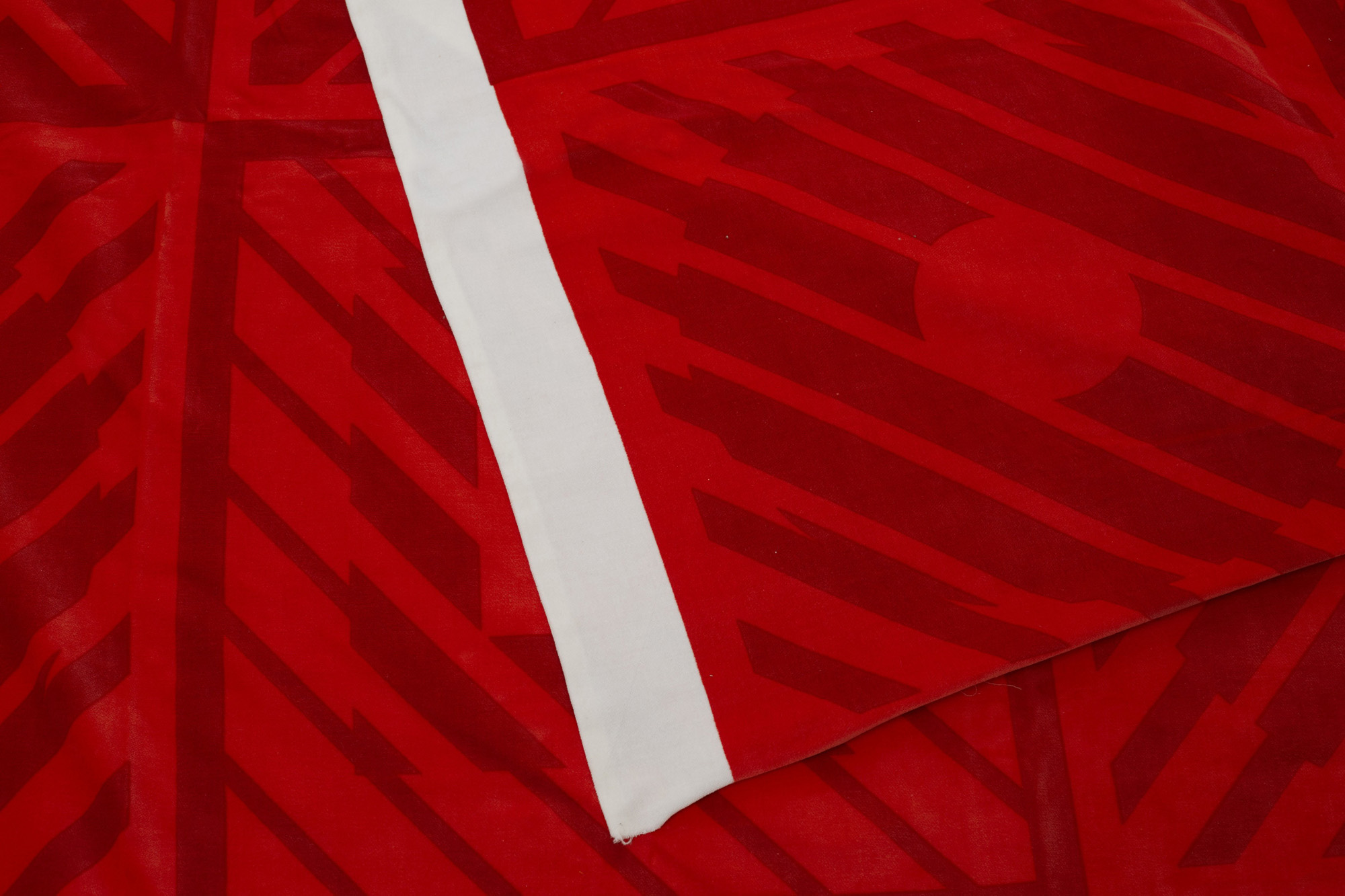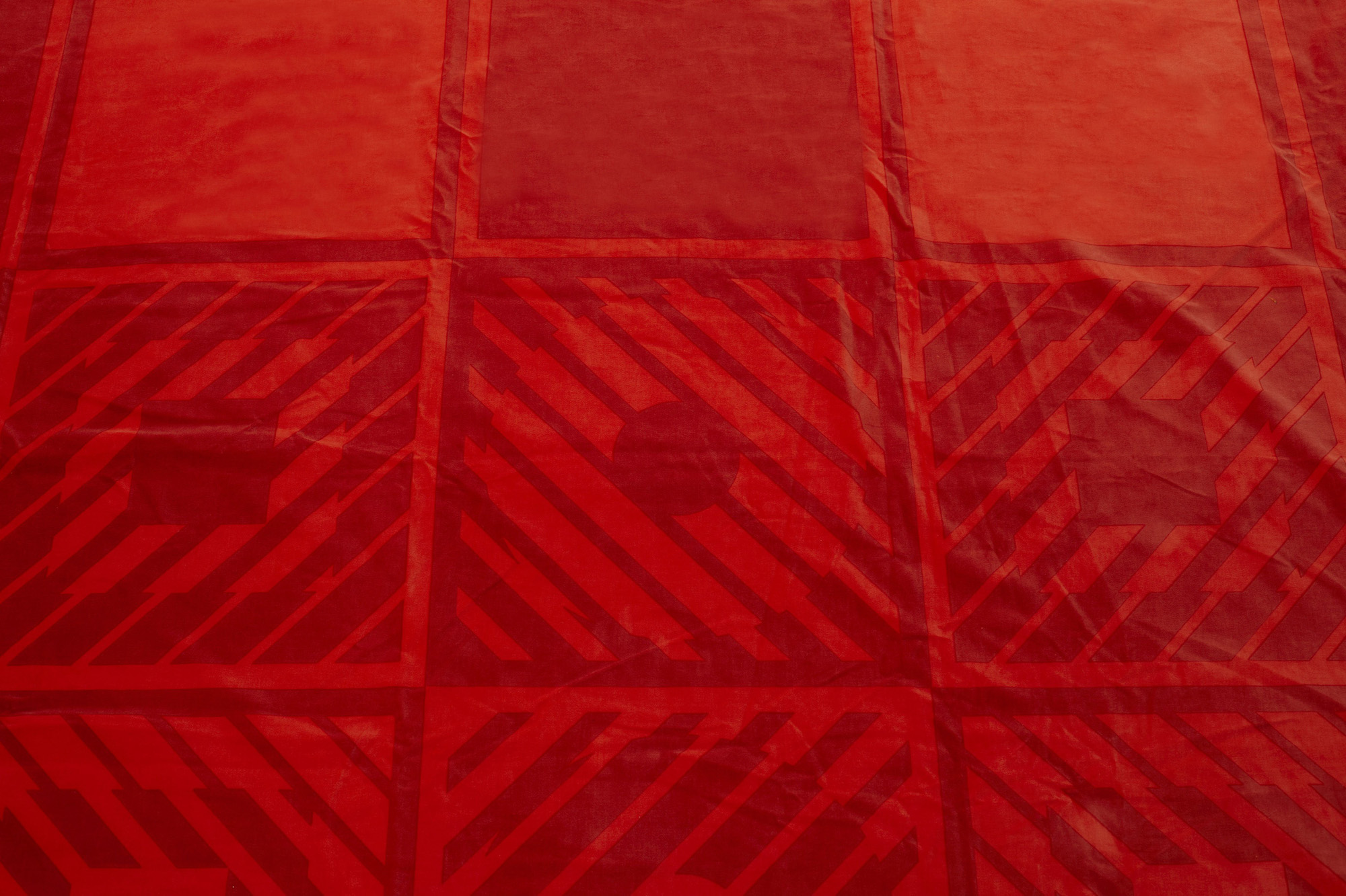 Tessuto attribuito alla manifattura di Ross F. Littell, in velluto di cotone stampato manualmente, disegni a riquadri geometrici nei toni del rosso chiaro e rosso scuro.