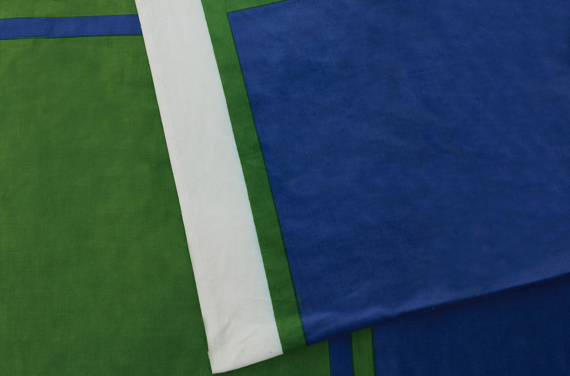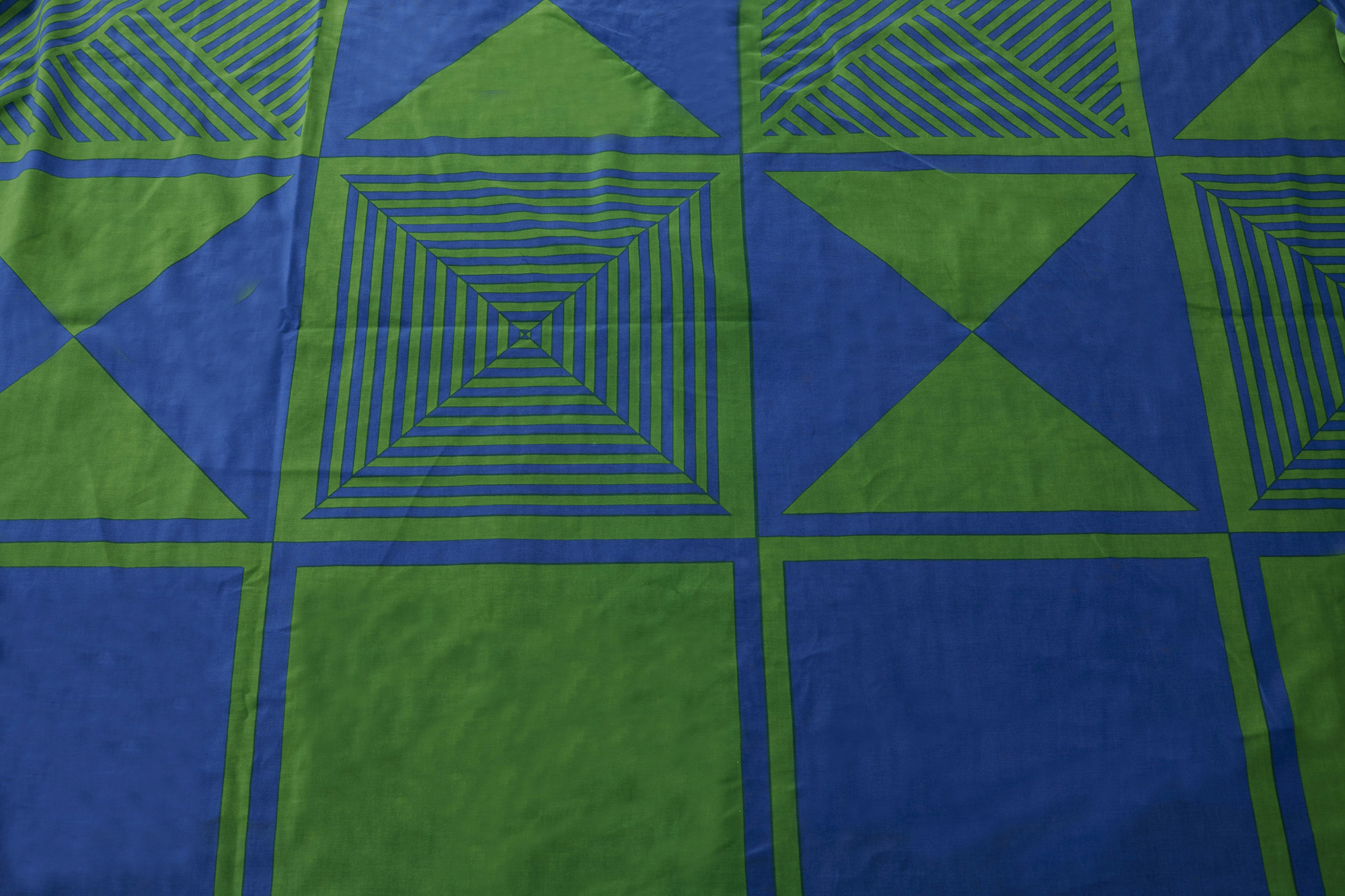 Tessuto attribuito alla manifattura di Ross F. Littell, in velluto di cotone stampato manualmente, disegni a riquadri geometrici nei toni del blu e del verde.