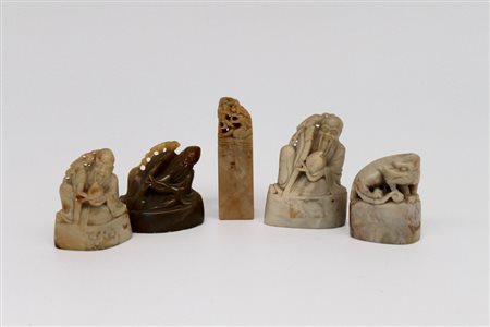 Lotto di tre figure , un sigillo e un animale fantastico in pietra saponaria - Lot of three figures, a seal and a fantastic animal in soapstone