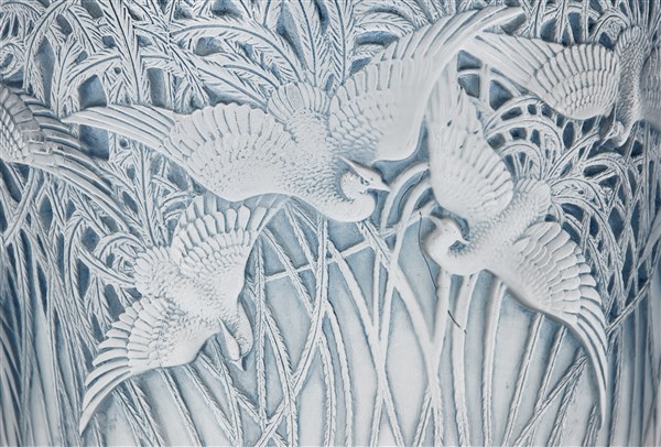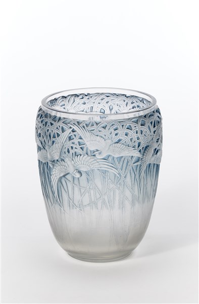 Vaso modello "Aigrettes". Esecuzione Lalique, Francia, 1926ca. Vetro incolore opalescente soffiato in stampo e patinato azzurro. In catalogo dal 1928 al 1932 e non ripreso dopo il 1947. Firmato alla piccola mola sotto la base "R LALIQUE FRANCE". (h cm 25,5) (lievi difetti)
