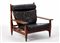 Grande poltrona con struttura in massello di legno centroamericano, cuscini imbottiti e rivestiti in pelle nera. Probabile produzione brasiliana. Anni '50. (cm 98x89x97) (lievi difetti e restauri)