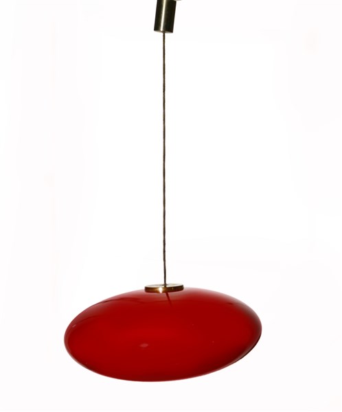 Lampada a sospensione con paralume in vetro incamiciato rosso, montatura in ottone. Italia, anni '50/'60. (h cm 85; d cm 45) (lievi difetti)