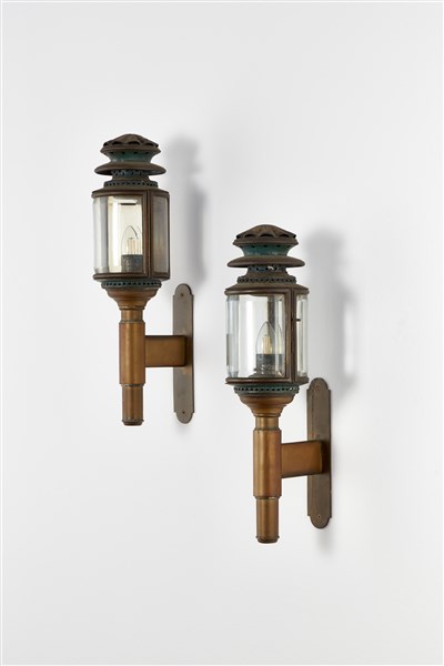 Coppia di appliques a lanterna di stile Novecento in ottone e cristallo molato. Milano, anni '30. (h cm 50) (lievi difetti)