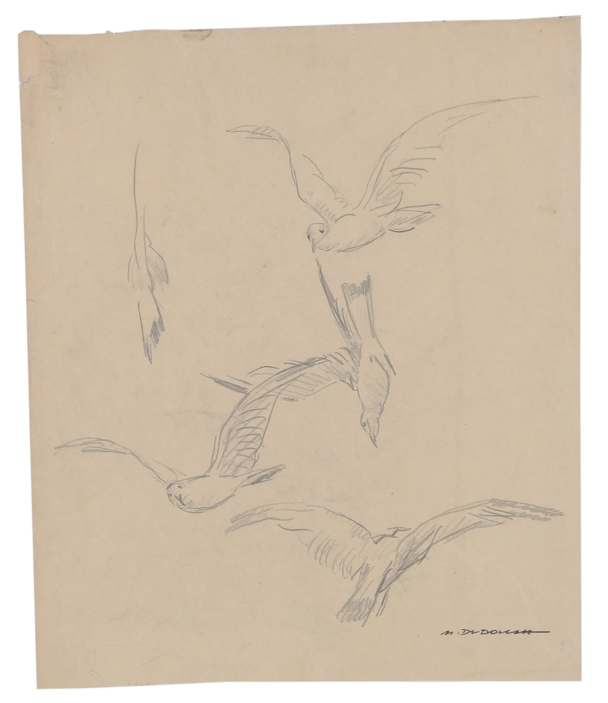 MARCELLO DUDOVICH Trieste 21/03/1878 - Milano 31/03/1962  Studio di uccelli matita su carta cm. 39x33,5; firma in basso a destra, timbro dello Studio Dudovich al retro, dichiarazione d'autenticità di Giampaolo Resentera su foto, pubblicato a pagina 17 del catalogo "Marcello Dudovich 1878-1962" a cura di Giovanni Granzotto, Giorgio Corbelli Editore, presenta un restauro alla carta in alto a sinistra.