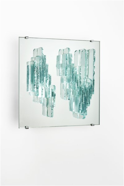 Two-light wall lamp. Holland, 1980s. Structure in gray painted steel, square mirror sheet with application of linear elements in very thick crystal. Bearing the production's label. (29.5x16x29.5 cm.)