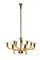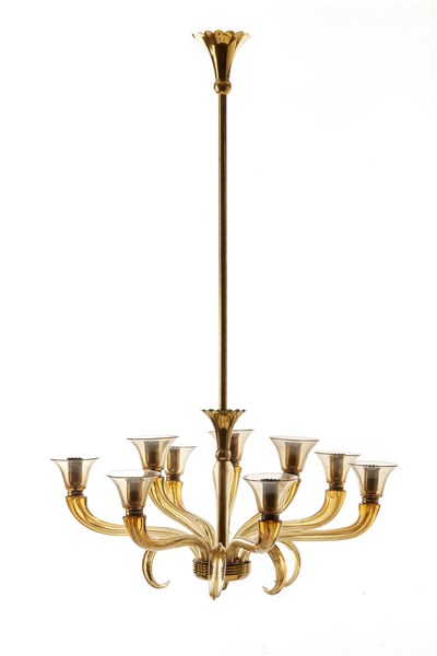 Lampada a sospensione a nove luci in vetro soffiato pagliesco con paralumi a coppa e inserti in ottone. Murano, anni '30. (h cm 110) (rotture e mancanze)