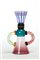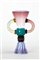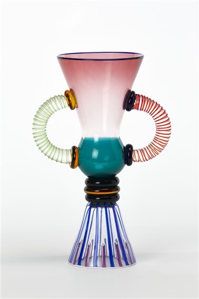 Vaso biansato in vetro soffiato trasparente ametista chiaro e verde, coronamento conico in vetro incolore a canne blu, lattimo e ametista, applicazioni a fili in vetro incolore, arancio, nero e verdino. Probabile manifattura Gino Cenedese, anni '80/'90. (h cm 28,5)
