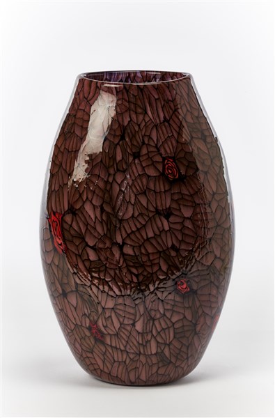 Vaso in vetro soffiato a murrine nere, marroni e conformate a rose rosse. Murano, anni '90/2000. (h cm 28)