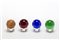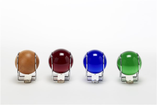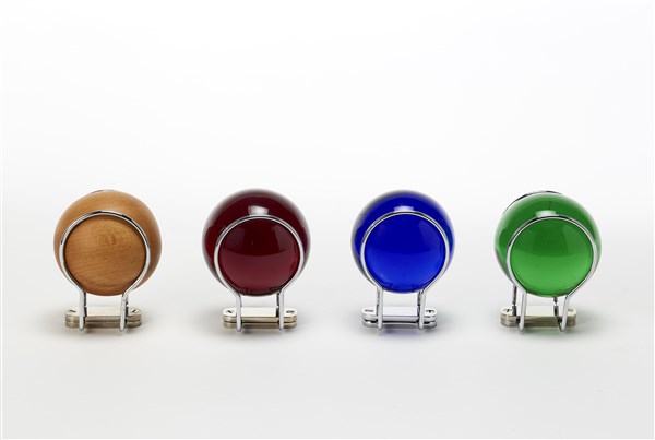 Four wall hangers. Produced by Fontana Arte, Milan, 1994. Steel, blue, green, amethyst and wood glass spheres. (d 7 cm.)