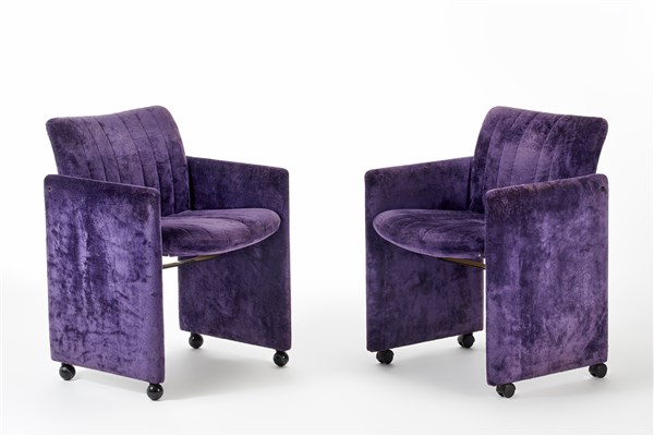 Lotto di due poltroncine su rotelle modello "Montebello". Produzione Simon Gavina, San Lazzaro di Savena, 1984/1985. Rivestimento in velluto viola. (cm 58x78x63) (lievi difetti e piccole sostituzioni)