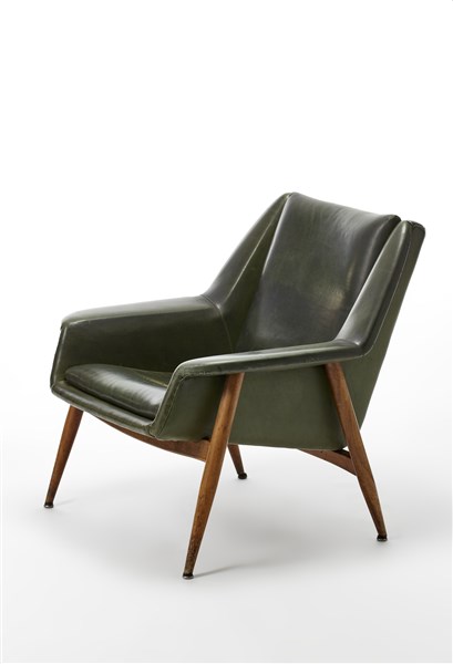 Poltrona modello "854". Produzione Cassina, Meda, anni '50. Struttura in legno e rivestimento in similpelle verde. Recante etichetta cartacea del produttore. (cm 76x76x76) (difetti)