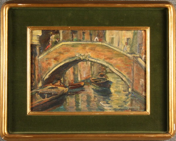 Firmato, datato. SCARPA CROCE LUIGI - Venezia, 1901-1967. Ha partecipato alle mostre di Cà Pesaro e alla Biennale di Venezia. Nel 1930 è stato chiamato quale cunsulente artistico alla I Quadriennale di Roma. Dipinto olio su cartone raff. ''SCORCIO DI CANALE CON PONTE A VENEZIA''. Firmato in basso a destra. In cornice. Mis. Lung. cm. 33,5 Alt. cm. 24 ca.