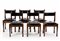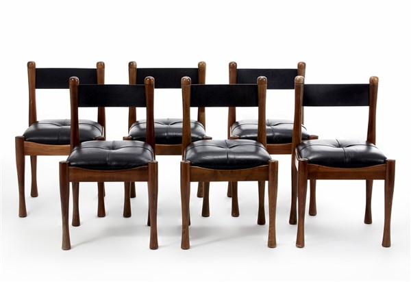 Lotto di sei sedie modello "620". Produzione Bernini, Milano, 1964. Legno di noce massello con gambe tornite, sedile in pelle. (cm 49x81x47) (difetti)