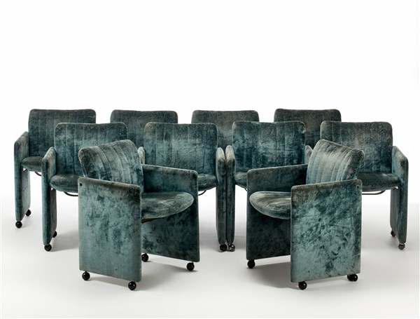 Lotto composto da dieci poltroncine su rotelle modello "Montebello". Produzione Simon Gavina, San Lazzaro di Savena, 1984/1985. Rivestimento in velluto verde. (cm 58x78x63) (lievi difetti, piccole mancanze e sostituzioni)