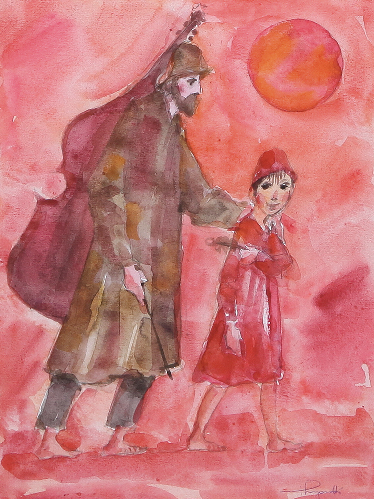 TRENTO LONGARETTI Treviglio (Bg) 27/09/1916 Musicante e bambino, 2012 acquerello su carta cm. 31x23, firma e anno in basso a destra, dichiarazione d'autenticità dell'artista su foto.