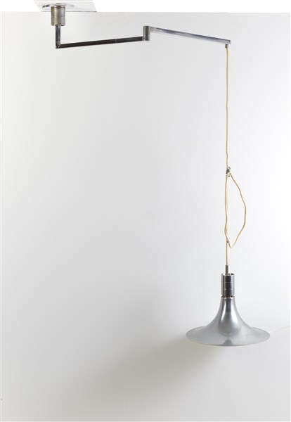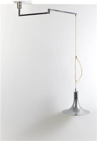 Lampada a sospensione della serie "AM/AS". Produzione Sirrah, Milano, 1969. Braccio snodabile e paralume in metallo cromato e verniciato bianco. (d paralume cm 39,5) (lievi difetti)