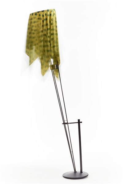 Lampada da terra modello "Aria". Produzione Antonangeli, Italia, anni '80. Struttura in metallo vernicato nero, base in ghisa, paralume in tessuto a pois verdi, ventilatore incorporato. Marcato sotto la base. (h cm 230) (difetti)
