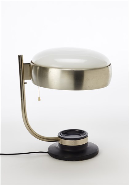 Lampada da tavolo modello "729". Produzione Lumi, Milano, anni '60. Alluminio, allumino verniciato nero e metacrilato. Posacenere asportabile. (h cm 39; d cm 29) (lievi difetti)
