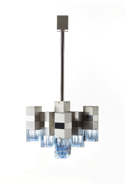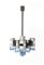 Lampada a sospensione a nove luci in accaio inox, alluminio anodizzato e diffusori in vetro trasparente azzurro e lattimo. Italia, anni '70. (h cm 100) (lievi difetti)