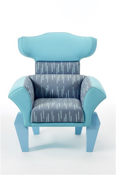 Poltrona imbottita. Italia, anni '80. Gambe in legno laccato azzurro e rivestimento in tessuto stampato azzurro e grigio realizzato per l'occasione. (cm 89x104x75) (lievi difetti)