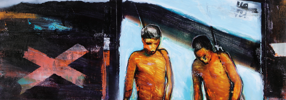 MIRKO PAGLIACCI Losanna 1959 Sconfinamenti, indios smalto e acrilico su tela cm. 30x84, firma e titolo al retro, dichiarazione d'autenticità dell'artista su foto, certificato della telemarket (BS) allegato.