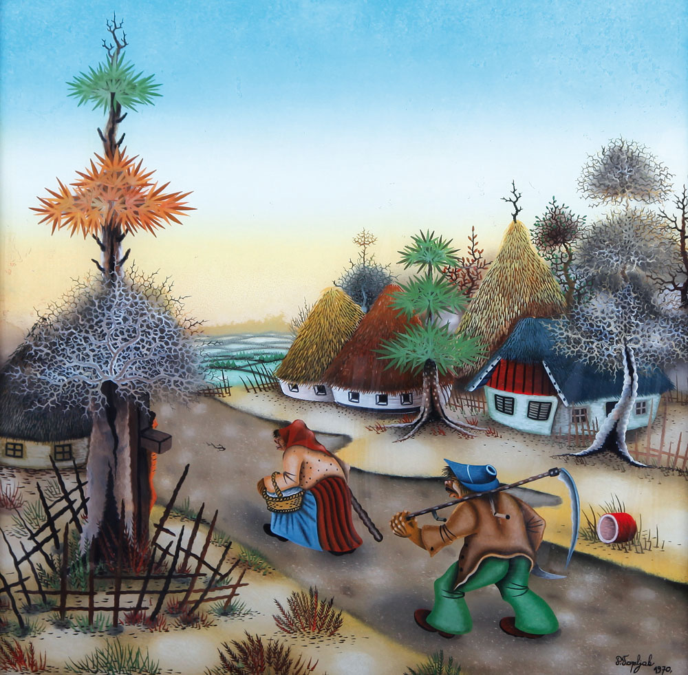 PERO TOPLJAK Durdevac (Croazia) 08/01/1948  Il ritorno dai campi, 1970 olio su vetro cm. 46,4x46,9; firma e anno in basso a destra, etichetta della Galleria del Cortile (NO) al retro.