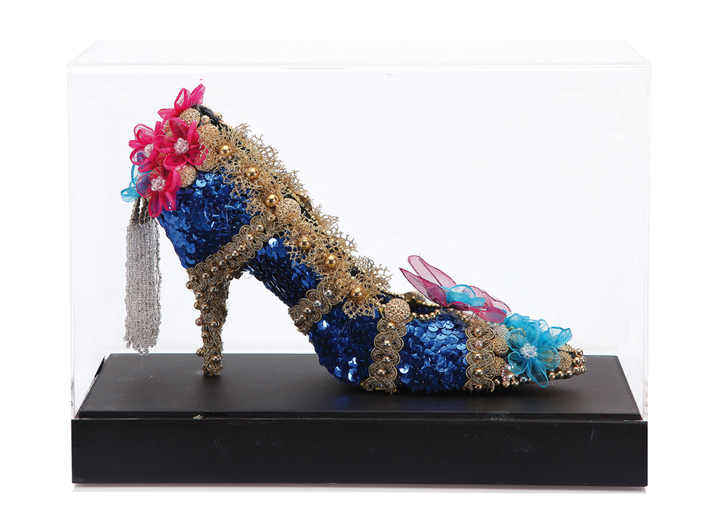NURA O’LARA Beirut (Libano) 1972 Sherazade I, 2001 tecnica mista e applicazioni su scarpa da donna cm. 24x32x18, firma ed etichetta della Galleria Oprandi (Clusone-BG) sotto la base, dichiarazione d'autenticità dell'artista ed etichetta della Galleria Oprandi (Clusone-BG) su foto, entro teca in plexiglass.