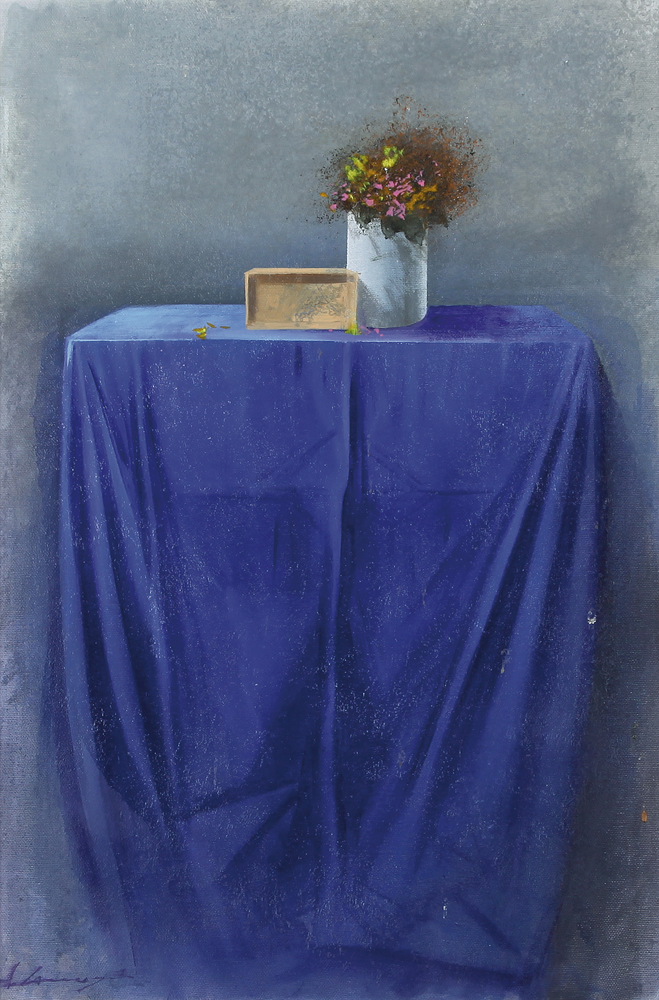 AGOSTINO CANCOGNI Forte dei Marmi 26/11/1950 La tavola blu olio su tela cm. 60x40 firma in basso a sinistra, titolo, firma e certificato Telemarket 2 al retro.