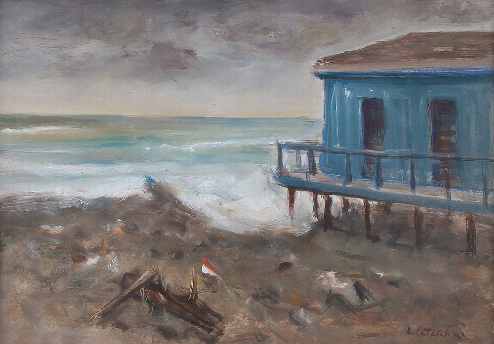 ALFREDO CATARSINI Viareggio 17/01/1899 - Viareggio 28/03/1993  Marina Versiliese, 1950 olio su tavola cm.36,5x50, firma in basso a destra, titolo, firma e anno al retro, dichiarazione d'autenticità dell'artista su foto.