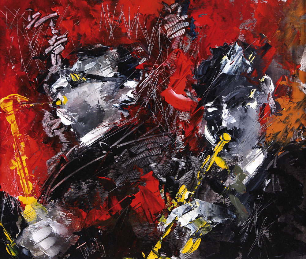 FRANCESCO TORALDO Catanzaro 1960 Duo Jazz (Barron Trio), 2006 acrilico su tavola cm. 46x55, firma in basso al centro, titolo e firma al retro, dichiarazione d'autenticità e archivio dell'artista su foto.