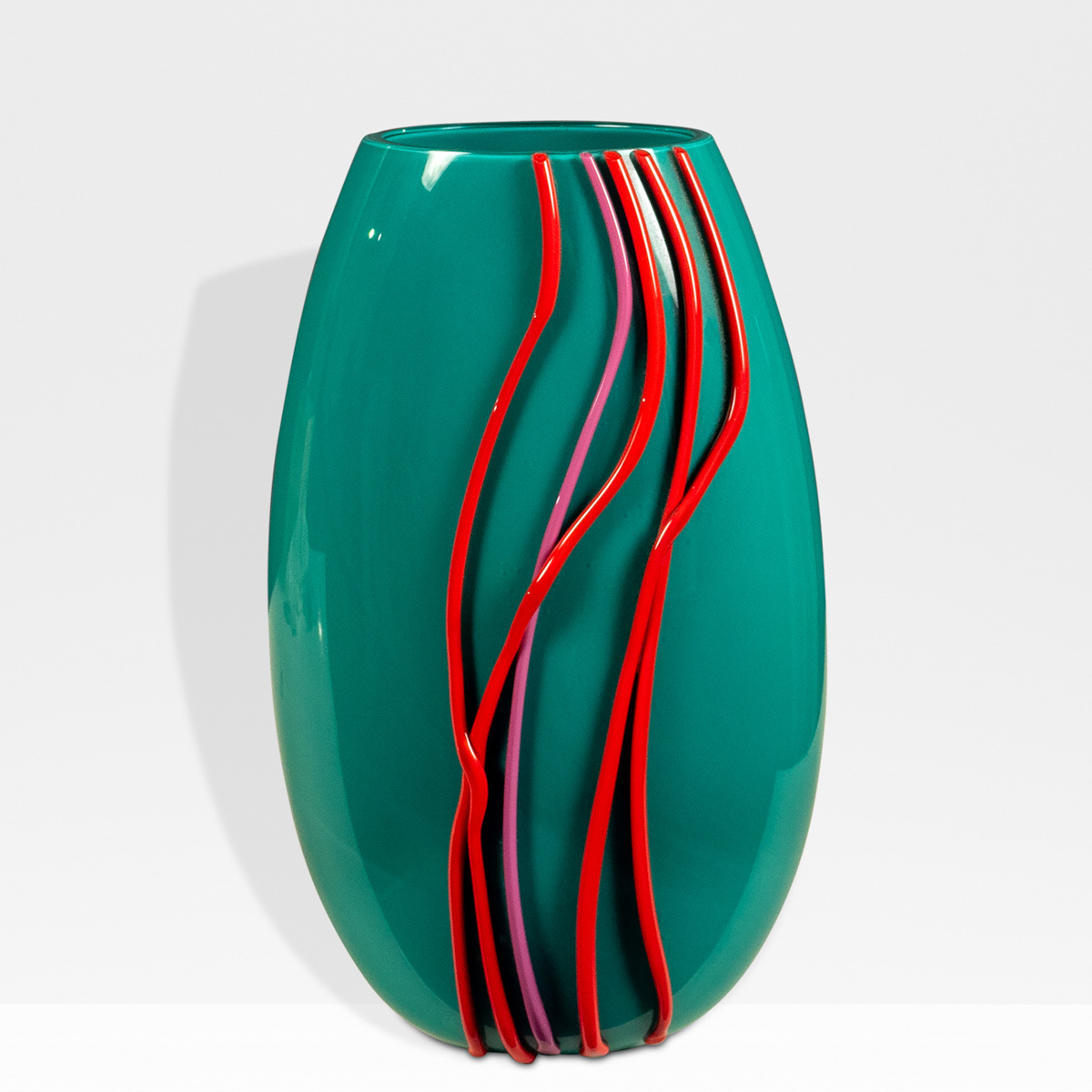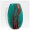 Gianni Versace, prod. VeniniMurano 200034,5x10x12,5 cm.vaso Rave in vetro opalino verde con applicazione in vetro rosso e lavanda, firma a punta Venini Versace 2000 sotto la base, etichetta originale