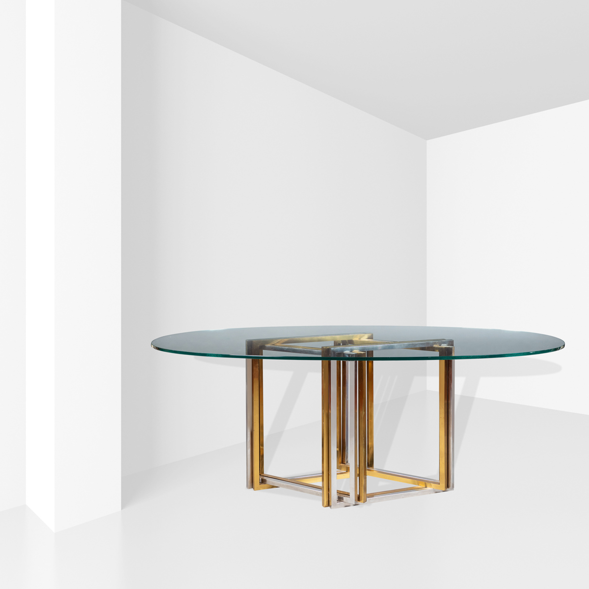 Romeo RegaItalia, anni 7073x188x108 cm.tavolo in acciaio, acciaio dorato, piano ovale in cristallo