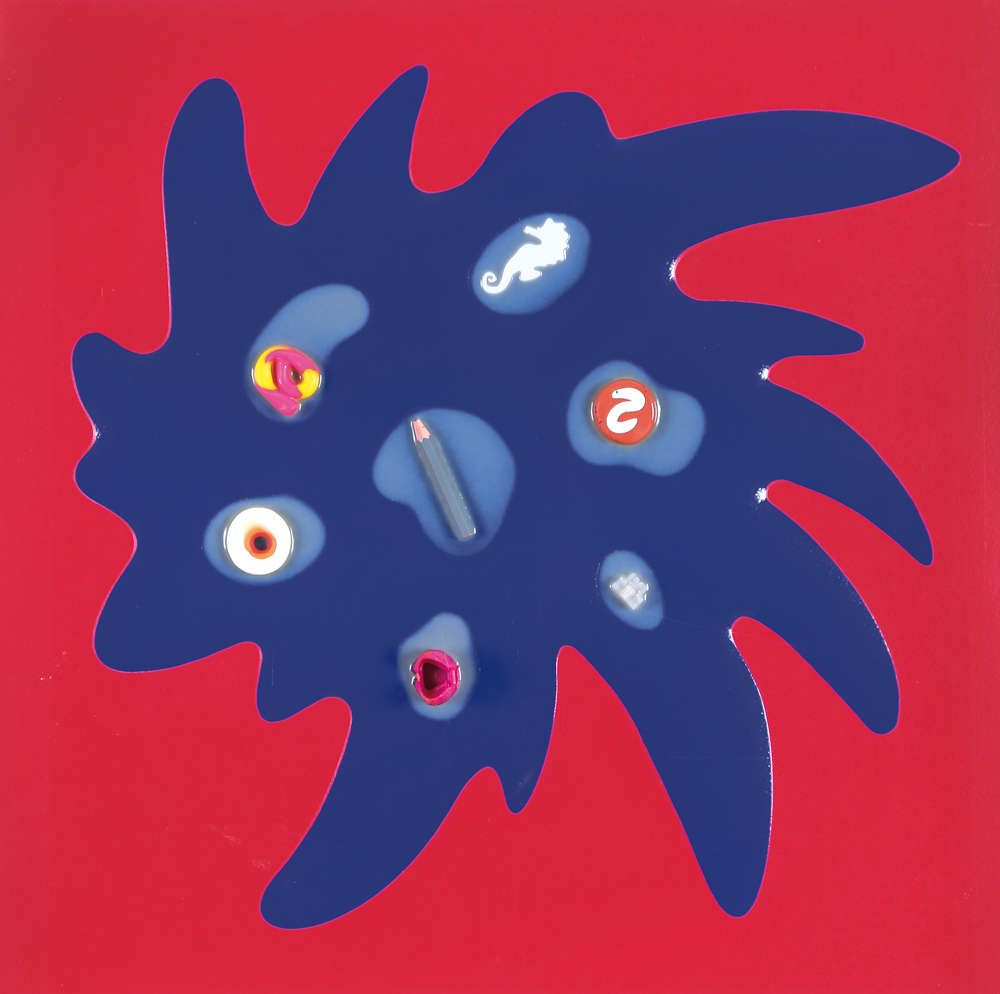 RENZO NUCARA Crema 1948  Bang 10-37, 2011 resine, oggetti, colore serigrafico, carta, legno su faesite cm. 50x50, firma, archivio dell'artista e descrizione dell'opera al retro, dichiarazione d'autenticità e archivio dell'artista su foto, entro teca in plexiglass.