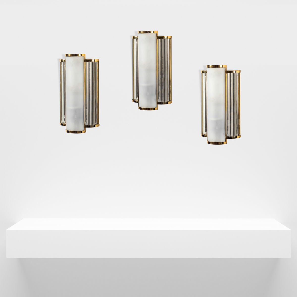Manifattura italiana (3)anni 40-5031,5x17x8 cm.tre appliques a listelli, vetro satinato trasparente, ottone