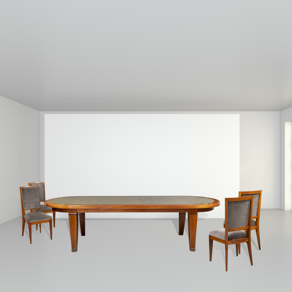 Manifattura francese (9)XX sec.77x300x112 cm. - h. 100 cmtavolo da pranzo con otto sedie in stile Art Decò, mogano, cristallo e tessuto imbottito
