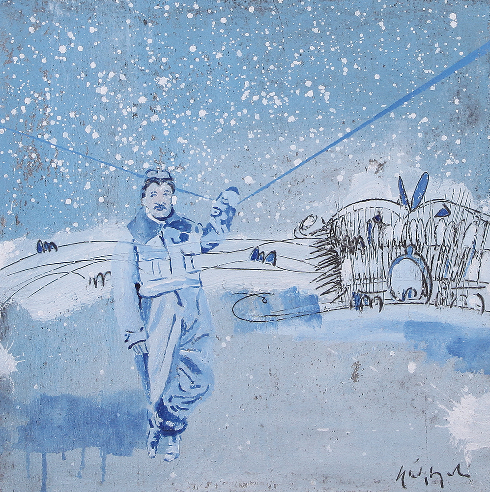 LUCA GIOVAGNOLI Rimini 1963 Prossimo decollo, 2006 olio su tela cm. 50x50, firma in basso a destra, titolo, firma e anno al retro, dichiarazione d'autenticità dell'artista su foto, opera priva di cornice.