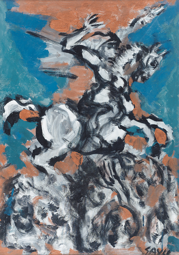 PIERO GAULI Milano 06/06/1916 - Milano 04/01/2012  L'apocalisse di San Giovanni, 2007 olio su tela cm. 70x50, firma in basso a destra, firma, titolo e anno al retro, dichiarazione d'autenticità dell'artista su foto.