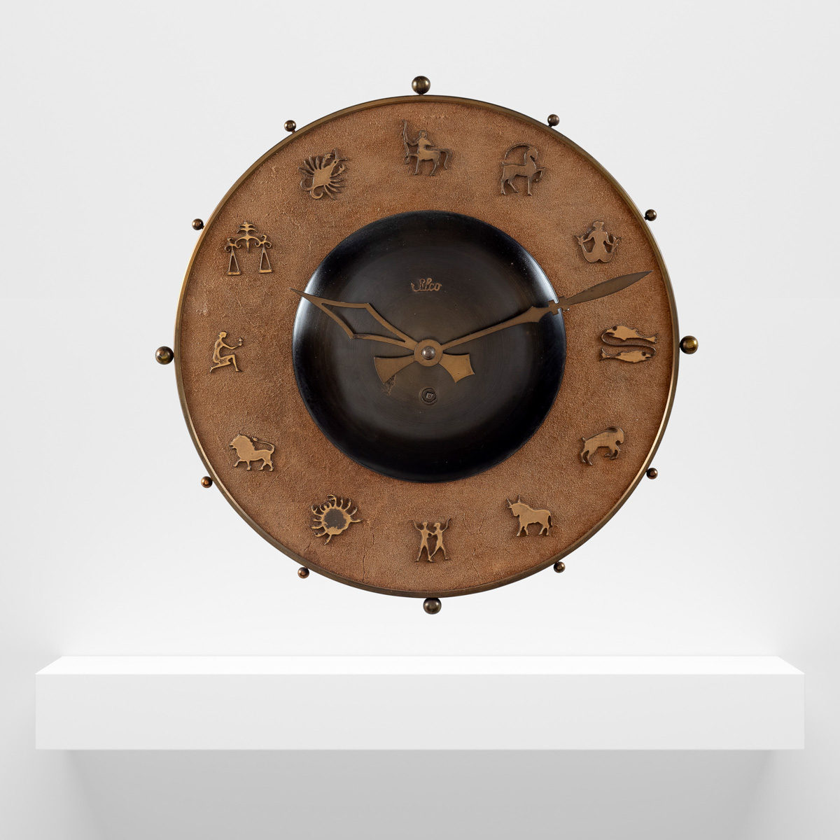 Gio Ponti, attribuitoItalia, anni 50d. 40 cm.orologio da parete con segni zodiacali Silco, ottone e tessuto