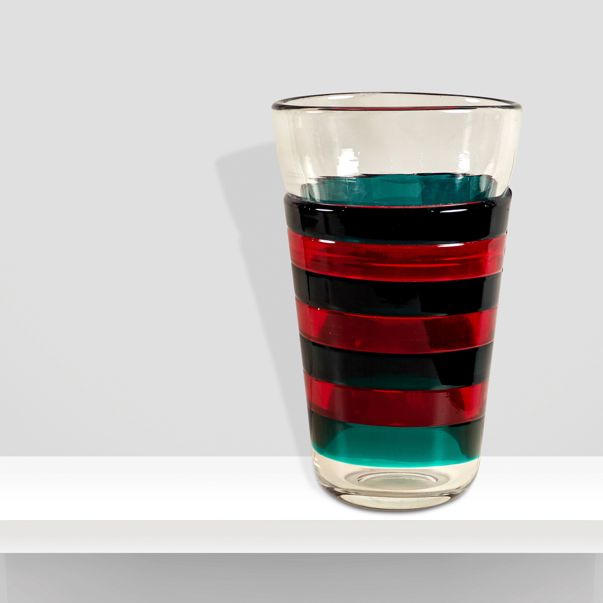 Manifattura italianaanni 80-9032x17x20 cm.vaso in vetro trasparente, decorato da fasce orizzontali verdi e rosse, reca marchio Gucci sotto la base