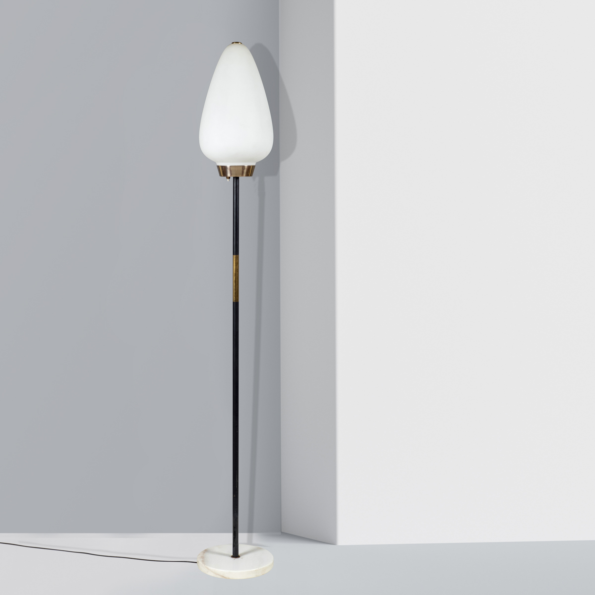 Stilnovo, attribuitoItalia, anni 50h. 173 cm.lampada da terra, ottone, metallo verniciato, vetro opalino satinato, base circolare in marmo