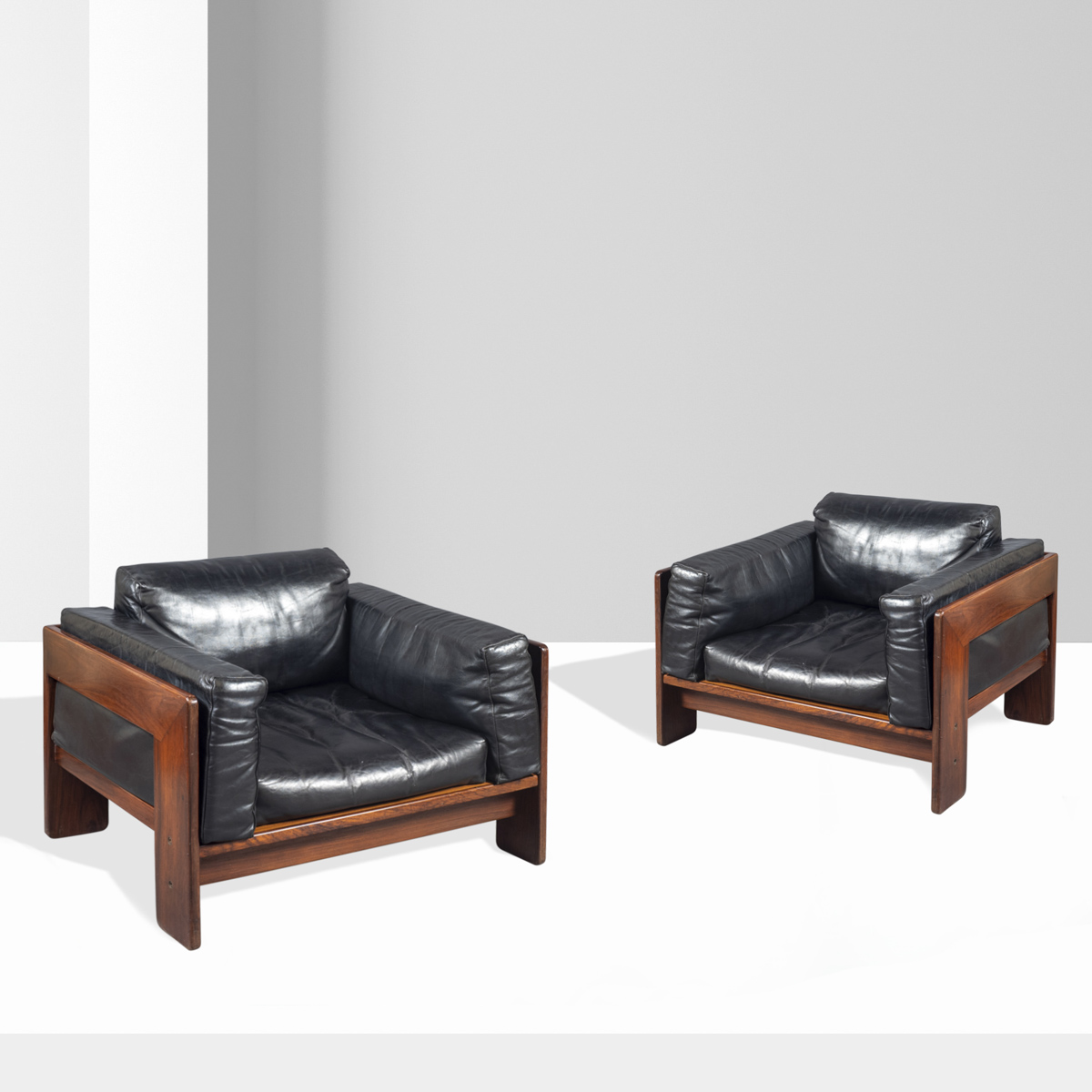 Afra e Tobia Scarpa prod. Gavina (2)Italia, anni 6070x90x78 cm.coppia di poltrone mod. Bastiano, struttura in legno, pelle nera imbottita