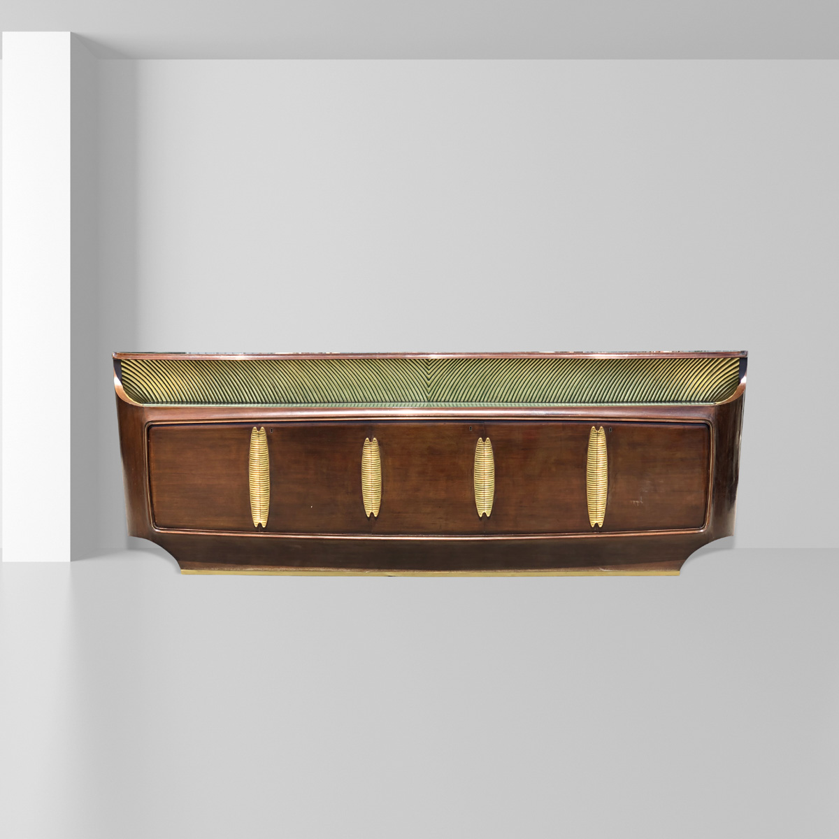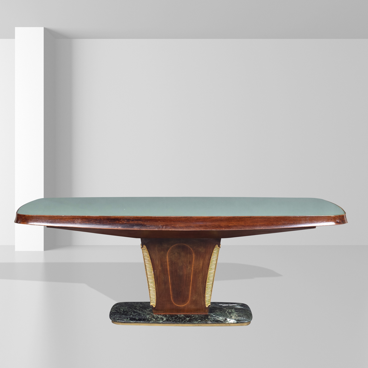 Vittorio Dassi (3)Italia, anni 50-60tavolo 80x225x100 cm.sala da pranzo in legno di noce, legno dorato e laccato, ottone e vetro, composta da un tavolo, un mobile bar e una credenza