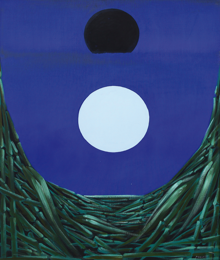 CESARE PEVERELLI Milano 30/05/1922 - Parigi 10/03/2000 Campo di canne, 1971 olio su tela cm. 100x81, firma in basso a destra, timbro e firma della Galleria Alberto Schubert Arte Moderna al retro.