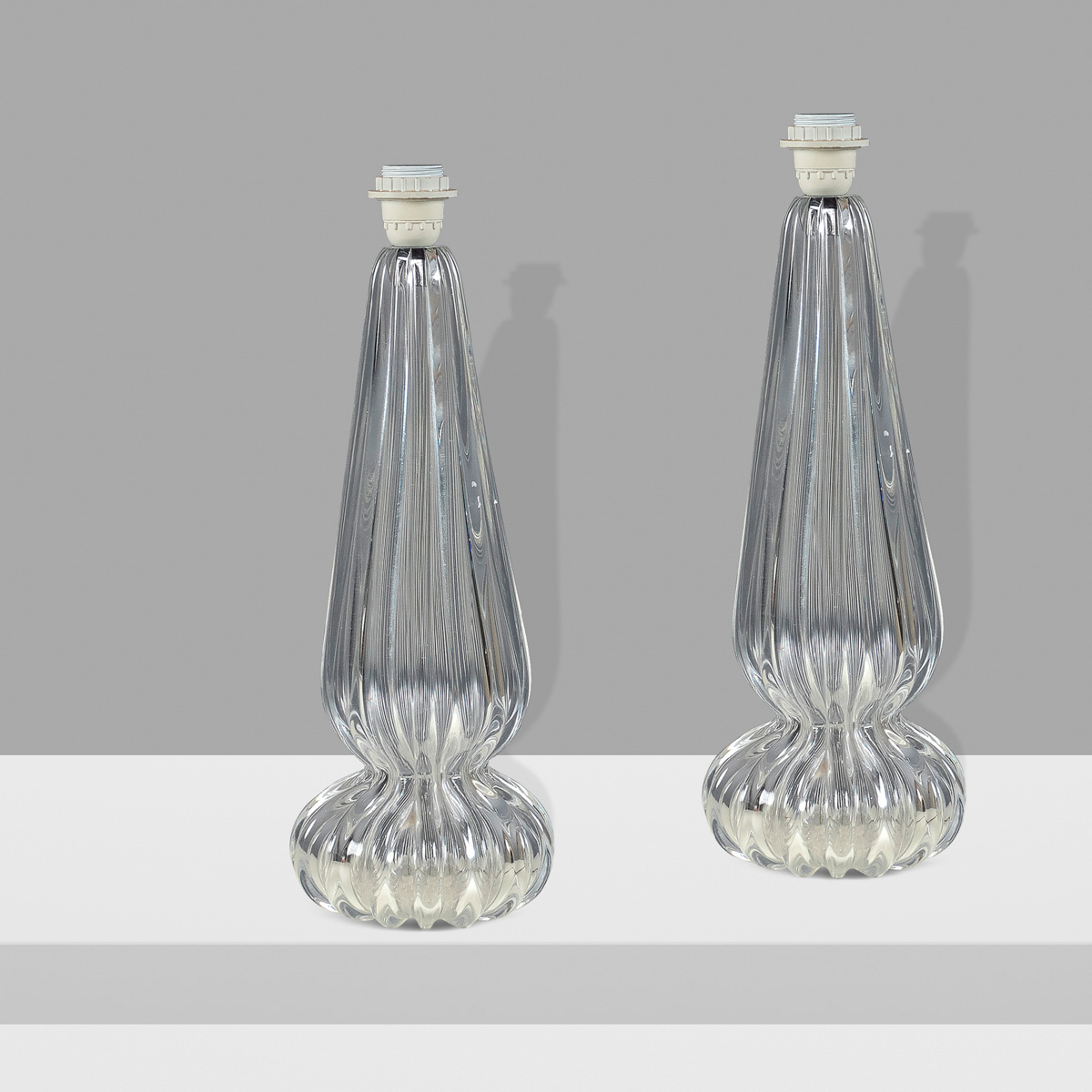 Barovier & Toso (2)Murano, anni 50-60h. 49 cm.coppia di lampade da tavolo in vetro trasparente, complete di paralumi