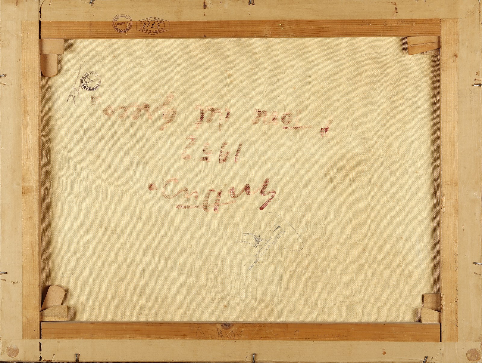GUTTUSO RENATO (1912 - 1987) Torre del greco. 1952. Olio su carta su tela. Cm 65,00 x 50,00. Firma e anno in basso a sinistra. Al retro titolo, firma e anno. Opera archiviata presso gli Archivi Guttuso, Roma come da documentazione fotografica allegata all'opera riportante il relativo numero d'inventario. Pubblicazione: Catalogo generale delle opere di Renato Guttuso a cura di E.Crispolti, Edizioni Mondadori, 1983, Volume I, n.52/35. Cornice presente