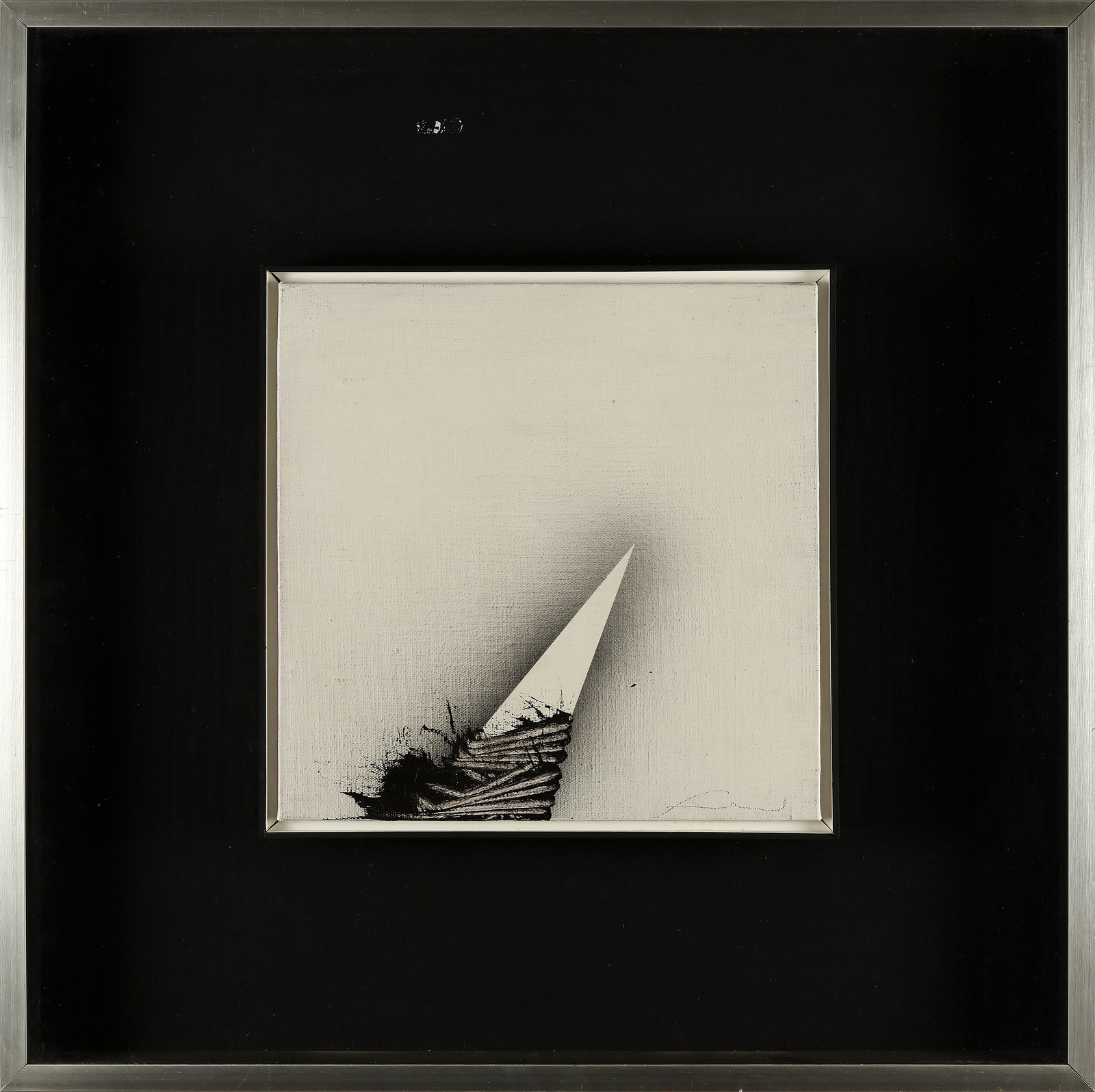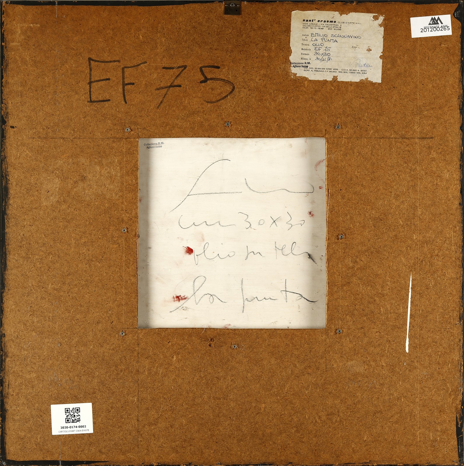 SCANAVINO EMILIO (1922 - 1986) La punta. 1975. Olio su tela tamburata. Cm 30,00 x 30,00. Firma in basso a destra. Al retro titolo, firma e cartiglio descrittivo Galleria Sant'Erasmo, Milano. Pubblicazione: Catalogo generale di Emilio Scanavino a cura di Giorgina Scanavino e Carlo Pirovano, Volume II, Electa edizioni, Milano 2000, pag. 618 tav.134. Provenienza: Collezione Stori, Bologna; Collezione Sarri, Sesto Fiorentino; Galleria Sant'Erasmo, Milano; Galleria Morone, Milano. Cornice presente