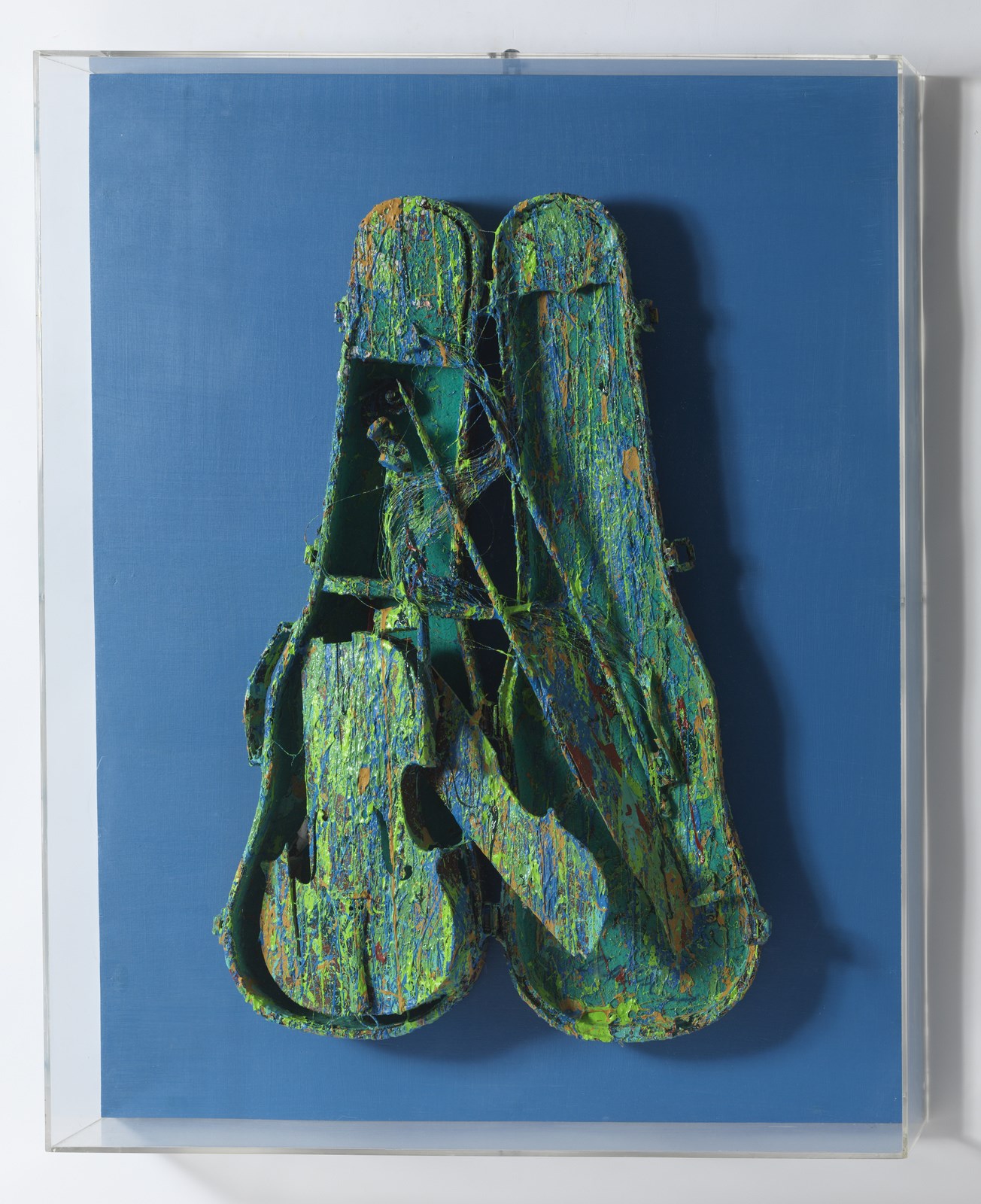 ARMAN FERNANDEZ (1928 - 2005) Senza titolo. 1991. Tecnica mista su tavola. Cm 80,00 x 100,00 x 25,00. Firma in basso a destra. Opera archiviata presso l'Archivio Denyse Durand - Ruel come da documentazione fotografica allegata all'opera riportante il relativo numero d'inventario. Entro teca di plexiglass.