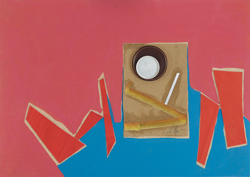 SERGIO DANGELO Milano 1932 Il racconto della montagna, anni '70 tecnica mista e collage su tavola cm. 50x70, firma al centro, titolo, firma ed etichetta della Galleria d'Arte (Gessate) al retro, timbro e firma per autenticità e provenienza della Galleria Allegrini Arte (BS) su foto, entro teca in plexiglass.