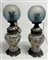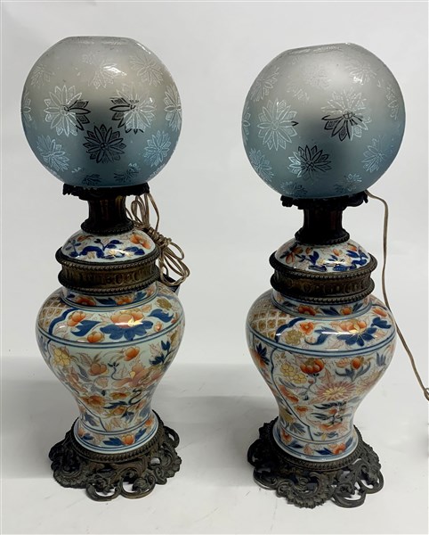 Coppia di lampade ad olio a decoro Imari, montatura in metallo dorato, paralume in vetro (h. tot cm 54) (lievi difetti, montate a luce elttrica)