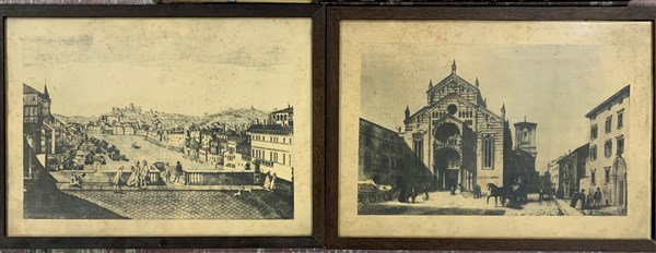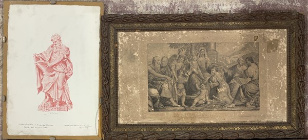 Lotto di quattro cornici contenenti stampe e riproduzioni diverse (difetti e mancanze)